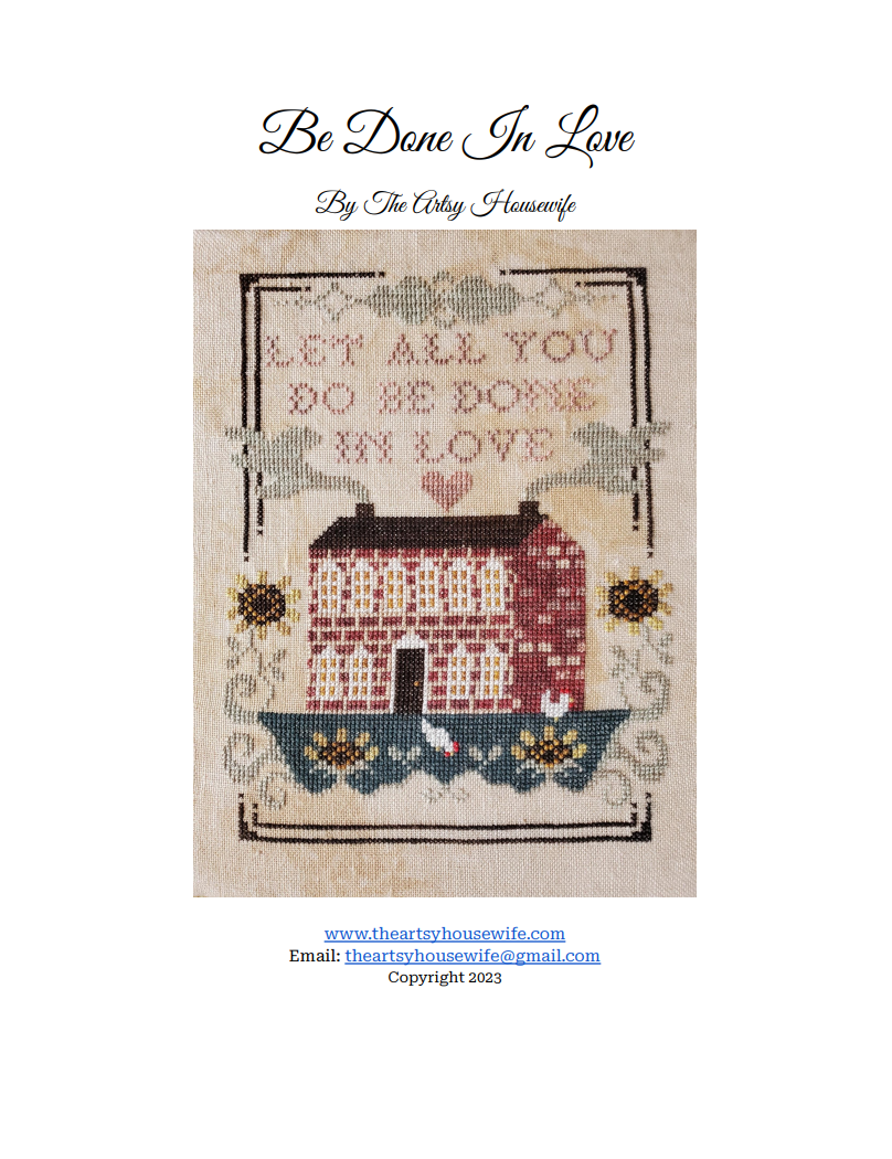 This listing is for a PDf (Pattern Keeper and Markup friendly) pattern of Be Done in Love, a counted cross stitch pattern by The Artsy Housewife.