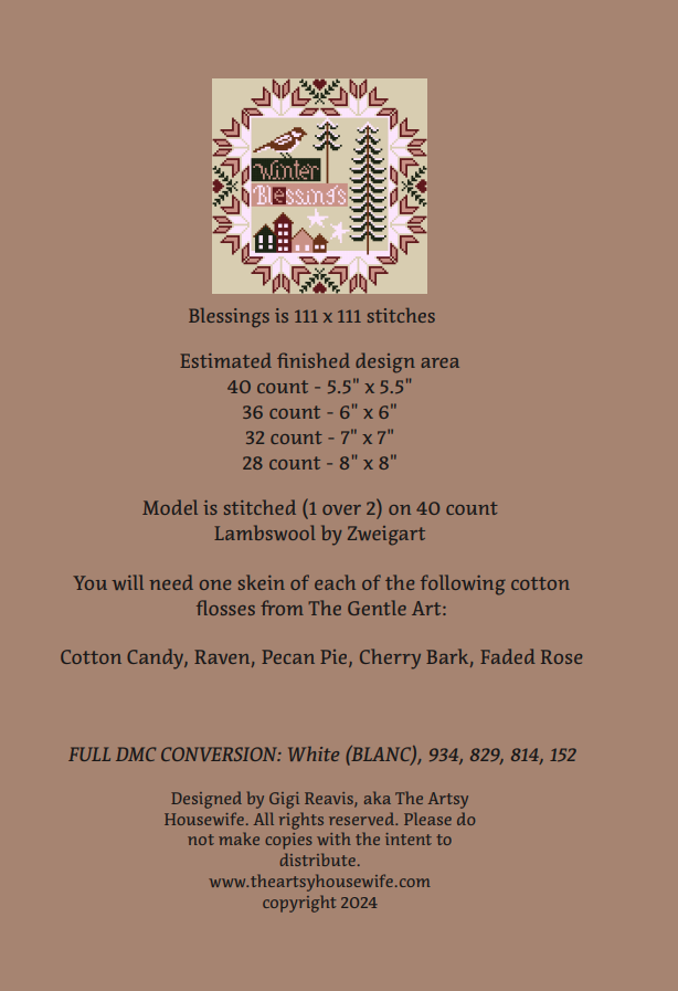 This listing is for a PDf (Pattern Keeper and Markup friendly) pattern of Blessings, a counted cross stitch pattern by The Artsy Housewife.