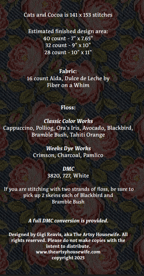 This listing is for a PDf (Pattern Keeper and Markup friendly) pattern of Cats and Cocoa, a counted cross stitch pattern by The Artsy Housewife.