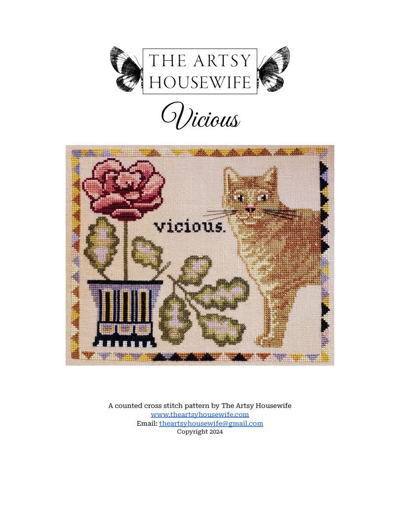 This listing is for a PDf (Pattern Keeper and Markup friendly) pattern of Vicious, a counted cross stitch pattern by The Artsy Housewife.